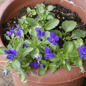「今朝のビオラたち💙」 可愛らしいく咲いています😉💕✌️ あら🤔植木鉢の真ん中辺りからも、 新しいビオラたちが出て来るのでしょうか…。