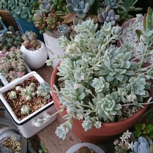 こんばんは( ⑉´ᯅ`⑉ ) 休憩中に📸゚+¨̮。˚ 暑すぎて 葉挿しからの4cmくらいの白牡丹丼 何個か色が🌚←w(大袈裟) 5鉢あるリトルミッシー2鉢が 茶色く( ᵒ̴̶̷̥́ ^ ᵒ̴̶̷̣̥̀ ) カクトロコサンのプロリフェラ2個が 🌚←(本当にこんな色) 仕方ない。この暑さぢゃ←大事♥️ また製作に戻ります(b๑•̀ㅂ•́)b✧