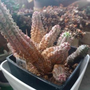 なんとも愛らしいお名前のミルクトロン様🥛 背筋がシュッと伸びて矍鑠としてます←😳 いささか子株がピンクがかってるのがチャームポイントですっ✨ 切り口から乳白色の液体が出るらしいですが、猛毒らしいデス😱見た目だけで判断しちゃいけませんねっ(๑・̑◡・̑๑)w