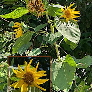 8月は葉月(はづき/はつき)、木々の葉落ちの月(はおちづき)とされる。 これは旧暦、現在でも使用されることもあるが、現行歴とはその1〜2月後位の季節感のずれがあるという。 最近、年毎にその熱さが増し暑さも募るようであるが、私の散歩道の道際等の草花達は、その熱い陽の中にあっても、己が自身を一生懸命に、最大限に自己表現に向けようとしているようだ。 7月からの、熱い夏へ、夏の草花達の姿 ---その14。 /太陽はこの花•この花は太陽、 背高く日射•黄色の花たち/ 7月は梅雨が明けた、その下旬の何時もの散歩道の道際。 真夏となった、たまらないほど汗をかきながらの何時もの散歩道。 その道際に出逢いみるは黄色の花たち。 それらは、高い背丈を更に高くして熱き日射の太陽に、その面を向けて、ジッとしてその陽に抗うようにも受け入れようにもして、その熱きに対峙しながら極限までそれを、受け入れているようであった。 それは、これらの花は何時も思うのは「太陽との関係は甚だ大きく、一心同体の関係にある」のだということ。 つまり、この花は太陽であり、太陽はこの花であろうと。 (だから、私は ‘もっとこの熱さに耐えて頑張らねば---‘ 、と、少し顔をしかめて頭を下にさげながらも、しっかり地面を見つめながら、それらの黄色の花の一つは、そう呟いていた。) ヒマワリ(向日葵/ニチリンソウ<日輪草>/ サンフラワー) <ヒマワリ(向日葵)について、「ヒマワリ」(Wikipedia)より抜粋、次に: 花は黄色で、種は食用となる。 日廻りや日回りと表記されることもあり、また、ニチリンソウ(日輪草)、ヒグルマ(日車)、ヒグルマソウ)日車草)、ヒマワリソウ(日回り草)、サンフラワー(英)、ソレイユ(仏: 太陽)とも呼ばれる。 種実を食用や油糧とするため、あるいは花を花卉(かき)として観賞するために広く栽培される。 また、ヒマワリは夏の季語でもある。ロシアとウクライナ、ペルーの国花になっている。> ・ヒマワリ<向日葵、別名 ニチリンソウ< 日輪草>、ヒグルマ<日車>、ヒグルマソウ<向日葵草>、ヒマワリソウ<日回り草>、サンフラワー、ソレイユ>(キク科 ヒマワリ属) (備忘: ヒマワリの属性等について9/8or9/9 ‘21)