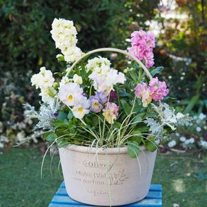 おはようございます しとしと☂️雨です。 昨日寄せ植え様に籠とお花集めてみました。 まだ仮置き状態の状態です。