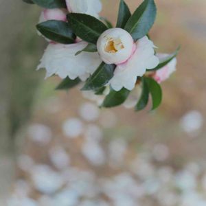 おはようございます。 朝の木漏れ日の中でお茶の花が輝いていました。