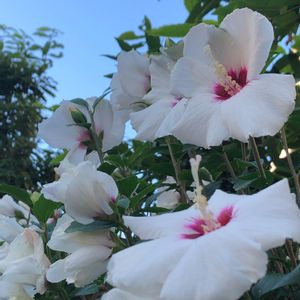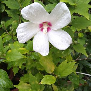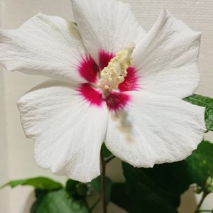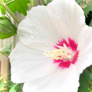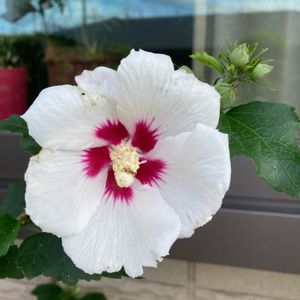 🍀ムクゲ🍀 白地に赤く・・・この品種は日の丸というみたい。😁 葉っぱの色が悪いから肥料切れかな〜 一日花だけどまだ蕾があるし、 液肥あげるから頑張ってね🤗🤗🤗 🏷白い水曜日♡ 🏷水滴の水曜日に参加させて下さいね。