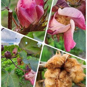 チャメン[茶綿] アオイ科ワタ属 畑でピンクの花が咲いていたので見せてもらいました。 綿は茶色ですが写真より少しベージュ色に近い色でした。 白綿と茶綿と緑綿があると教えてもらいましたが、緑綿は見たことが無いです