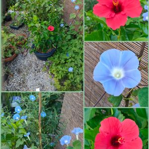 こんにちは☀ 今朝はハイビスカス🌺のお花2つ咲きあさがおは庭のあちこち200個位咲きました☺️