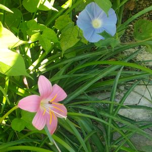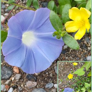 こんにちは☀ こぼれ種で咲いてるポーチュラカ💛のお花と庭に何処にでも植えてるあさがお🩵のお花です✨