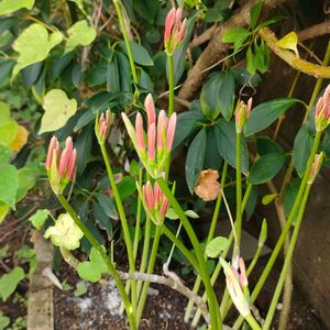 こんばんは🌃 昨日の蕾のサフランモドキのお花🩷咲きました。 朝顔のお花は庭の何処にでも咲いてます😍