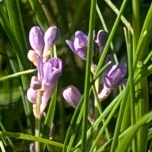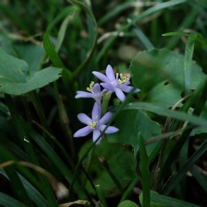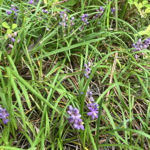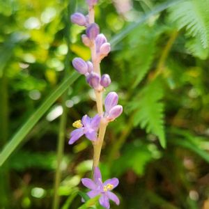 ヒメヤブラン(姫藪蘭) キジカクシ科ヤブラン属の多年草 花期:7〜9月 分布:日本全国 生育環境: 陽当たりの良い草地ほか 海岸のクロマツ林にも広く分布 ランナーを横に伸ばし増え、群生することが多い 山に入るまでの日当たりの良いアプローチで沢山見られましたが、樹木の茂る場所に入るともう見かけませんでした。 ヤブランよりも小さく草丈5〜10㌢ほどと、小さいですが、薄紫色の花弁に黄色い雄蕊がとても魅力的な花です。 📷 2025/7/8