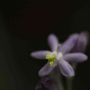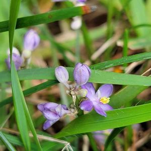 ヒメヤブラン キジカクシ科ヤブラン属 葉は長さ7~20cm、幅2~3mmの線形。花茎は高さ10~15cmで、葉よりかなり短く、直径約1cmの淡紫色の花がまばらに付きます😊 花被片、雄しべともに6個。雄しべは雌しべを避けるように曲がっています。雌しべもそっぽ向いてる?😂 (↘)右下は、花被片8個、雄しべも8個ありますね🤭アララ