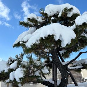 GS今日のお花🌼 マツ(松) 午前の散歩道 近くの松。 昨日からの雪で松も雪の中 ①クロマツ(黒松) マツ科 マツ属 ②コロラドトウヒ 別名 ブンゲンストウヒ マツ科トウヒ属 ツインズで立っています。 ③コロラドトウヒ こちら並木で。