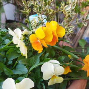 明るい色のビオラと シルバープリペット リガストラムシネンス 覚えられる訳ないやろ〜😁 寄せ植えにして 増えたムスカリを隙間に ボコボコ植えてみた🤭