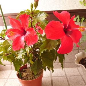おはようございます! 昨夜からの台風🌀が心配で小さなベランダから玄関に避難しました。数少ない私のお花たち。 今日はお友達が遊びに来るので、ハイビスカスさん咲いてくれています。 いつも来客がある時は必ず咲いてくれるかわいいコです(*^^*)