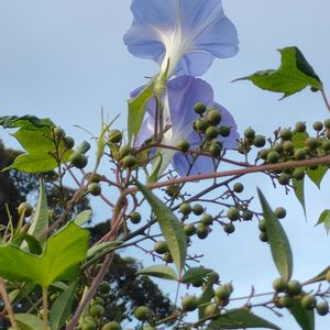 こんにちは⛅ 庭のどこでも咲いてるあさがおのお花今日は南天の実の所に咲いてます☺️