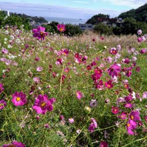 海の見える丘のコスモス畑、海の向こうに伊豆大島が見えました✨✨ みかん狩りとコスモスの花を沢山摘みました💕