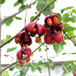 はじけて可愛いツリバナマユミの実 和室前の庭は隣家が映り込んでしまうので全体が撮れないのが残念だけど、ヤブランの紫とツリバナマユミの赤い実、マムと、ススキ🌾、まだ緑のヤマモミジなどで、秋の風景を楽しませてくれています!!