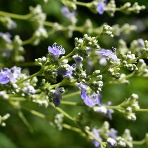 多分… ニンジンボク(人参木) クマツヅラ科の落葉低木 花期:7月~8月頃 掌状複葉が対生、小葉は先の尖った広被針形で3~5枚、粗い鋸歯。花は枝先や上部葉腋から出る円錐花序に、唇形で小さい淡紫色の花を多数つける。 2025.6.21 松戸市本土寺にて📷️