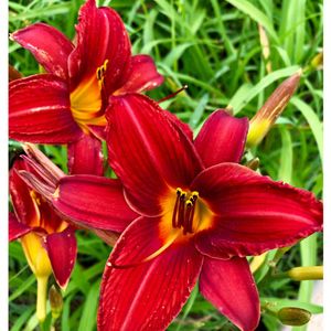 《ヘメロカリス》 庭に咲いているヘメロカリスです。 初夏から夏にかけて次々と花を咲かせる多年草で、日本にはニッコウキスゲやノカンゾウ・ヤブカンゾウが自生し、古くから親しまれてます😊✨。暑さ寒さに強いうえ、土壌も選ばず植えっぱなしでよく育ちます💕。 「デイリリー」と言う英名のとおり花は一日花ですが、一本の花茎にたくさんの花を咲かせ、何本も立ち上がるので、長期間花が楽しめます😃🎶。