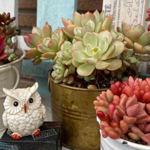 晴空。 告白します。 実はね・・・ 皆さんの投稿を見ていて、可愛いなぁと興味も出てきて・・・。 少〜しづつ多肉さんを集めていた事を💕😉 10月31日に可愛いお値段になっていた寄せ植えさんをお迎えしていて投稿していました🖼✨ まだお花初心者なのになぁという思いと少し葛藤しながら。 その辺りから、なんとか育てる自信もついてきて✨🥰 GSで皆さんの投稿を見ながらお勉強スタート✨📝 伸ばさずに大きく成長させるのがポイントと気がついたり、徒長した物はカット整えて良い事も知りました💕 そして、ドキドキしながらこっそりとミニミニさん収集を🎶 まだまだ奥深くて、育てながら私も成長する予定です✨😉📚 左上から、Zの形でお名前紹介✨ 3〜4㎝のミニミニちゃん達で〜す💕 🖼 サブセシリス(エケベリア属) pickより少し紫っぽいです🎶 🖼 緑牡丹(エケベリア属) 後で気が付いたのですが、きっと少し伸びている感じなのかなぁ? 初心者目線で、よくわからないけど。😅 🖼 紅葉祭り(クラッスラ属) 実はこの子の赤色を見て、集めて育ててみたいなぁと手が伸びました✨😉 🖼ルンヨニー(エケベリア属) 下の方がペラペラになっていたけど、それは取り除いた方が良いのでしょうか? 🖼ブロンズ姫(グラフトペダルム属) 中央がグリーンで外側がシックな色合い✨ 可愛いなぁ💕 この子も伸びている?🤔 お迎えして、しばらくそのまま置いておいて、多肉さんの土を買ってきて持っていた容器に植え替えをして💕 ますます愛着が出てきました🎶 初心者なので、色合いで選んだので、状態や形もどれが良いとかも分からずのお迎えですが、大事に育てていきたいです✨🥰❤️ まだ可愛いお色の子達もお迎えしているので、また改めてご紹介したいと思います🎶 GSの皆さんに、形や成長や置く場所等、色々アドバイスを頂けるととっても嬉しいです💕 よろしくお願い致します🎶🙇 こちらは快晴で、日差しが気持ち良い朝です💕 お庭の植物達も嬉しいだろうなぁ🎶🌳🌸 素敵な日曜日になりますように✨🥰🍀