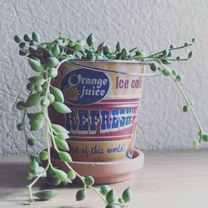 斑入りグリーンネックレス植え替え。 缶を重ねて2段鉢にしてみた。チョコレートファウンテンならぬグリーンネックレスファウンテンみたいな形にしてみようと思って😘
