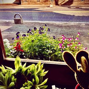 🌸多肉植物の向こう側のトレニア🌸 古民家の店先 窓からのプランター 朝の日差しの中で 切り戻しをしたトレニアが また花を咲かせました🌸 紫色とピンクの花が 風に揺れて和ませてくれます😁