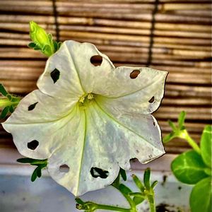 🌸新種のペチュニア 穴開き🌸 虫さんの作品 雨上がりにプランターのペチュニア の花がらつみに行ったら この花が咲いていました👀 きれいに花の周りに穴が空いている 見事にに花びらの周りだけに 🌸を🔍👀 ????❗️ 観察の結果 つぼみの先に虫が穴を一ヶ所開けた 後は食べなくて虫は他の花に移動 その後つぼみは花を咲かせた 以上が穴開きペチュニアの考察です!