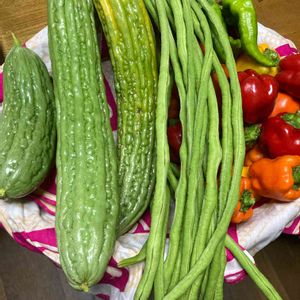 収穫野菜とフィリピン野菜を頂きました♪ フィリピンのゴーヤと豆です♪ パプリカは小さいまま色付きました🥲 万願寺とうがらしは少しだけ収穫出来ました♪