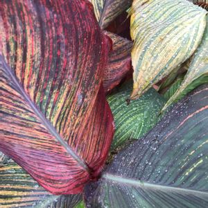 太陽の光が真上から降り注ぐと カンナ レッドストライプ の良さがよくわかります☺️ 下部の陽の当たらない暗い葉の色との差を見よ‼️ この落差がいいですよね〜ヽ(^o^)