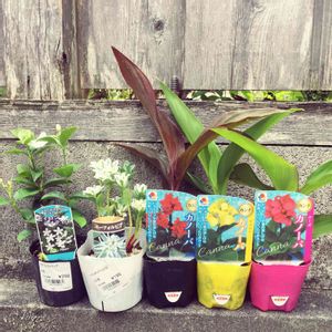 ホームセンターでハンティングしてきました👛😆 セイロンライティア🌸 ハツユキソウ🌿 赤、ローズ、黄色のカンナ🌼 初めてお迎えするので、育ってくれるかドキドキです😅😅😅 GSで勉強しなければ😉📝
