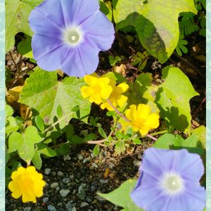 こんにちは☀ こぼれ種で咲いてるポーチュラカ💛のお花と庭に何処にでも植えてるあさがお🩵のお花です✨