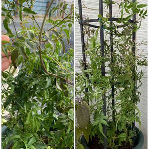 こんばんは〰️😆 土曜日に買ってきたジャスミンをほどいて大きめの鉢に植えかえました😊 小さなオベリスクがあいていたのでオベリスク仕立てにしました🎶 左から右に返信🕺 ジャスミン地植えで何箇所が植えてあります毎年葉は出てきますが花が咲く前に冬が来て枯れの繰り返しで! 鉢で育ててみる事にしました🪴😊