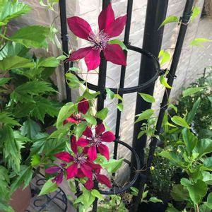 クレマチス/ピカルディ 〈パティオシリーズ〉 玄関先にそのみ飾れるとコンパクトなクレマチスです。玄関の門扉に置いていたら何回か花が咲いていたのですがいつの間にか門扉の上まで…。 余っていたオペリスクにつるを誘引しましたがやはりコンパクトにまとめた方がよかったかな? 蕾はまだあります🧡💕