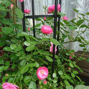 クレマチス マダムジュリアコレボンです🌿大鉢で2メートルのオベリスクに絡ませていますが、今年は強風で何度も倒れちょっとかわいそうな咲き方です💦 金子先生おすすめなだけあり、本当に花つきがよいです💡半分くらいでバッサリと切っても1ヶ月くらいで満開に咲いてくれます🌱友達にも自信を持っておすすめしてます😃