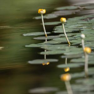 姫河骨 スイレン科コウホネ属 穏やかな水面に影を映しています。 花がコウホネより小さく、葉っぱが水面から出ないのが特徴。 自然遺産の森