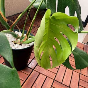 若葉が展開中🍀 このモンステラさんは「ヒメモンステラ」として売られてたけど、明らかにデカいから別品種なのかな❓🤔☘️