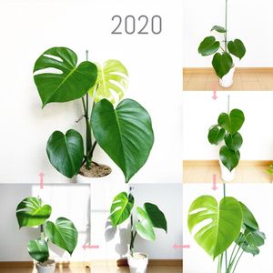 今年のモンステラの成長記録です。 うちに来た時は2枚の葉からスタートしました。そこから先日開いた6ヶ所割れてる葉は5枚目です。 途中3枚の葉をカットしたので今は4枚です。来春には今ある1番小さい葉をカットしたいと思ってます。 この成長ぶりから見ると…来年は巨大化決定ですね😅
