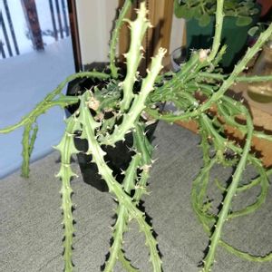 おはようございます😊 また、お迎えしてしまいました(笑)ホームセンターでお値引き500円✨垂れ下がりが好きで… しかしながら、名前がわからなくてユーフォルビアの仲間かなと。どなたか教えていただきたいです。