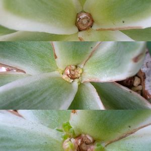 ①📸2025/04/24 エルイエロ錦開花しました🌼 満開になったので花のところを今日切りました✄脇芽が沢山ですが枯れるかな🤔 一緒の鉢に挿していたチョコチップと小人の花束も開花したので処分しました🐸 ②📸2025/04/24 スリラーパールもひっそりと開花しました🐸こちらも花芽を今日カットしました。 ③📸2025/04/25 シムランス小さいのに開花しました🐸可愛いお花🏵️こちらもカットしました🐸 ④📸2025/04/27 ㊤根っこがいつもカラカラでシワシワのままだった翡翠玉、先週からメネデール水に浸けていました。 メネデール水に浸けた翌日新しい根が早速出てきてもっと早くにやってあげれば良かったと思いました🙏💦ずっと切らしていたので翡翠玉のために買いました😉 ㊦ずっと水耕栽培ってわけにはいかないので元の場所に植えました。パゲアエが大きくなって可愛いです✨️💋✨️(真ん中パゲアエ、まわりは翡翠玉)