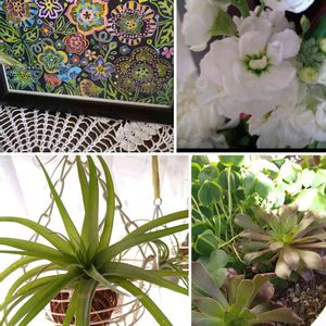 ➜から🕐回りに ・🏷今日のお花ストック白(切り花) ・カタバミの鉢に黒法師を挿していたら元気に根付きました ・エアープランツチランジアカピタータ ・先月は右半分を小さな額で 完成したので繋げて大きな額でへ 🏷9キュッとスクラッチアート参加します