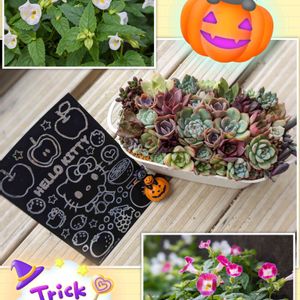 こんにちは😃 🏷9キュッとスクラッチアート 🏷ハロウィン月間 参加しまーす✨ 多肉植物の寄せ植え❣️今年の夏は暑すぎて、多肉ちゃんかなりダメージをうけちゃいました😅 寄せ植えも💦💦 結構、解体して寄せ集めちゃいました✨(*^^*) でも、それなりに可愛いく💕みえる👀親バカ😁(笑) スクラッチアート❣️初挑戦なので単純な物をと思って選んだKittyちゃん💕 はみ出したりの細かい事は気にせずにポジティ部♡🏷 今庭のトレニアを添えて(*˘︶˘*).。.:*♡