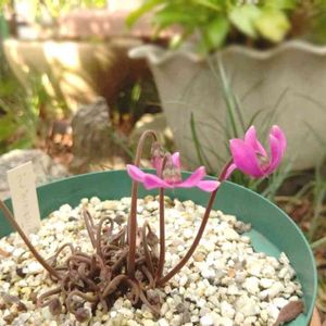 原種シクラメン プルプラセンス 酷暑の中蕾をつけてくれました。 大きな球根に育ってくれたネアポリタナムが腐ってしまいました😢なかなか難しい