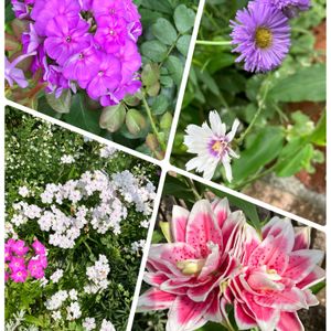 今のお庭のお花達🌸 ↖️↙️はフロックス✿︎ ↗️は種まきした白いカタナンケと紫のエリゲロン・アズールフェアリー🧚 ↘️は最近お迎えしたローズリリー
