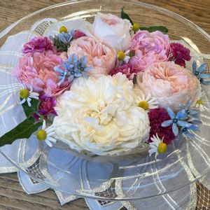 朝からひどい雨なので、今日は花遊び もちろん、お庭を一巡して花柄つみをしてきました☺️ まだまだきれいな子を浮かべてみました ①②は同じものだけど置き方で印象が違いますね ③④⑤クリスティアーナを一輪足して ボレロ メアリーローズ スイートチャリオット ウィリアムモーリス ブルースター カモミール クリスティアーナ