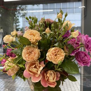 お店に飾ったパレード 一つ一つのお花が大きくて色濃い 春のお花とはまた違った迫力があります 朝お庭を眺めて バラをカットして 日中は仕事しながらバラを眺める事ができる幸せ💓