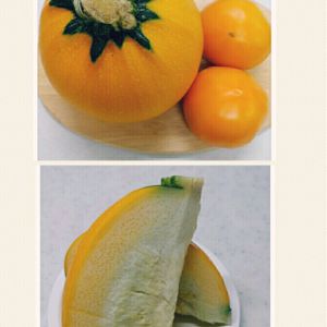 昨日珍しい野菜、丸型ズッキーニを頂きました。細長い物は知っていますが丸型で黄色いのも初めて見ました。ズッキーニもいろんな種類があるみたいです、今日はこれを調理してみたいと思います。隣の小さいのはトマトです。(*'▽'*)第一弾。