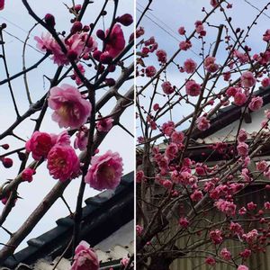 お隣さんの庭に咲く桃の花。後ろの斑入りの葉はアオキ。ずいぶん淡い花びらの色ですね。