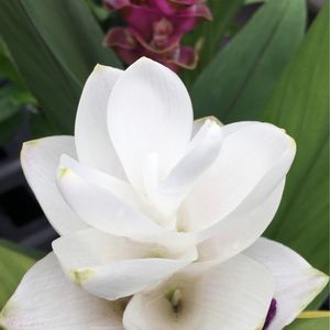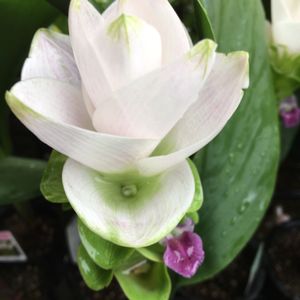 雨が降ったりやんだりの横浜⚓️ 以前から欲しかった、クルクマ。 やっとお迎えしました。嬉しい😍 生姜科で、ウコンの仲間。食用もあるようですが、これは鑑賞用です。 葉もスリムで立ち姿が美しい✨ 白花を上から見ると、蓮の花にも似てます😊