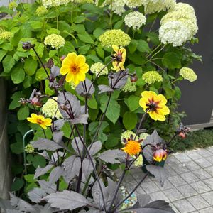 我が家のダリア花壇 ブラックナイトの花数が増えてきました 黒葉が花の黄色をより際立てています