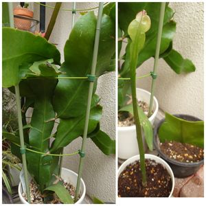おはよう〜ございます(#^.^#)☀ 以前花友さんからの🎁 「月下美人」 葉っぱ🌿をたくさん頂いて、 屋上に🌿、室内に🌿、 たくさんの鉢に成長してますが、この子はビロ〜ンと😲 それぞれ個性があって可愛い💕 なんとかお花が見たい❗❗😘