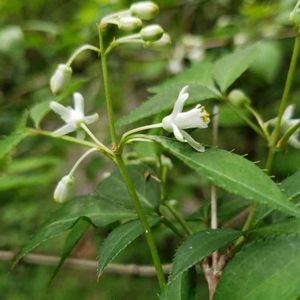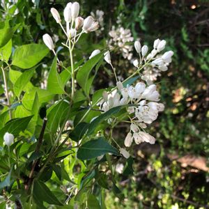 No.445 ミツバウツギ 和名:三葉空木 ミツバウツギ科ミツバウツギ属 その1 和名は、葉が3小葉で枝がウツギ(アジサイ科ウツギ属)のように中空であることから🎵 山道でこの下を歩くのは楽しい🎵 香りもいいし、爽やかな感じがします🎵 葉は対生で、3出複葉です🎵 花は8ミリくらい、花弁とがく片は共に5枚で白色です🎵 花弁は平開せず、雄しべ5個、雌しべ1個です🎵