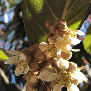 びわの花が咲いていました💕 今の時期に咲くのですね! 花もぎという作業があるようです😊